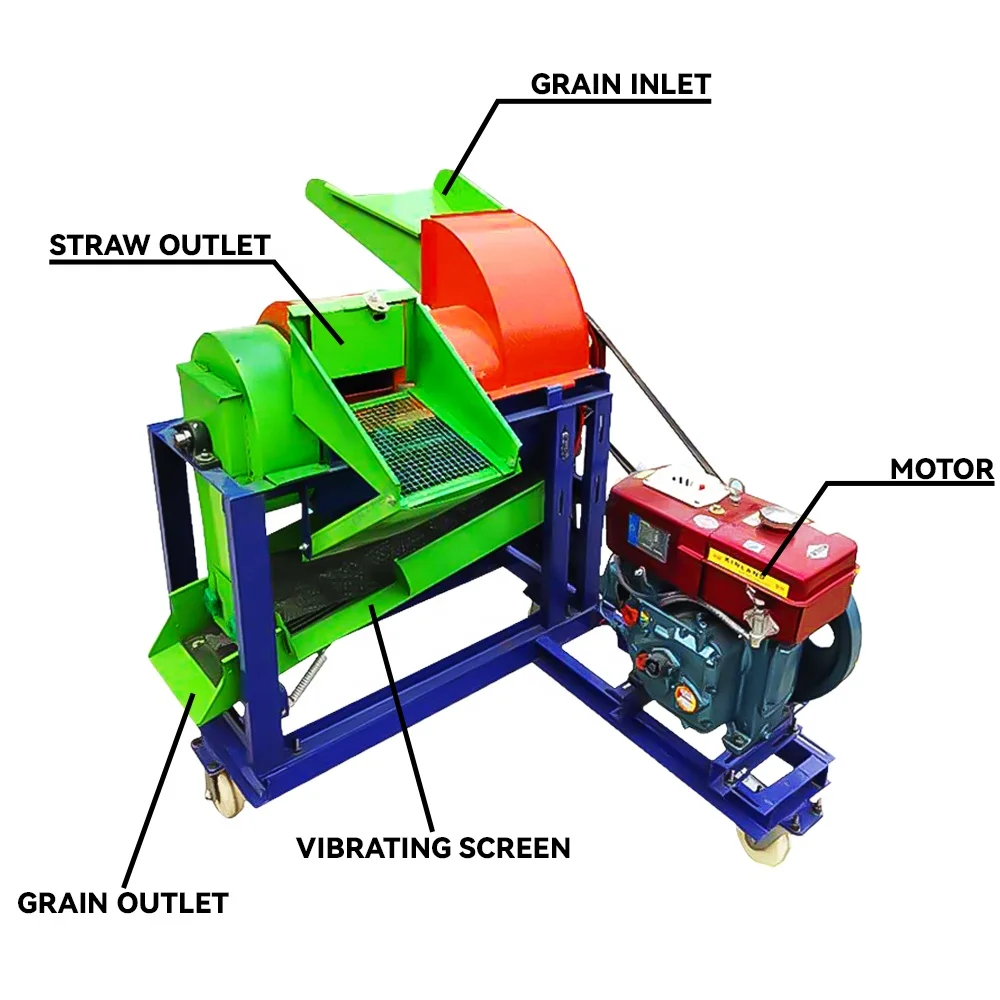 It can process common crops such as wheat, rice, rapeseed, sorghum, soybeans, corn, black beans, sesame, etc., and achieve efficient threshing by adjusting the drum speed and screen mesh